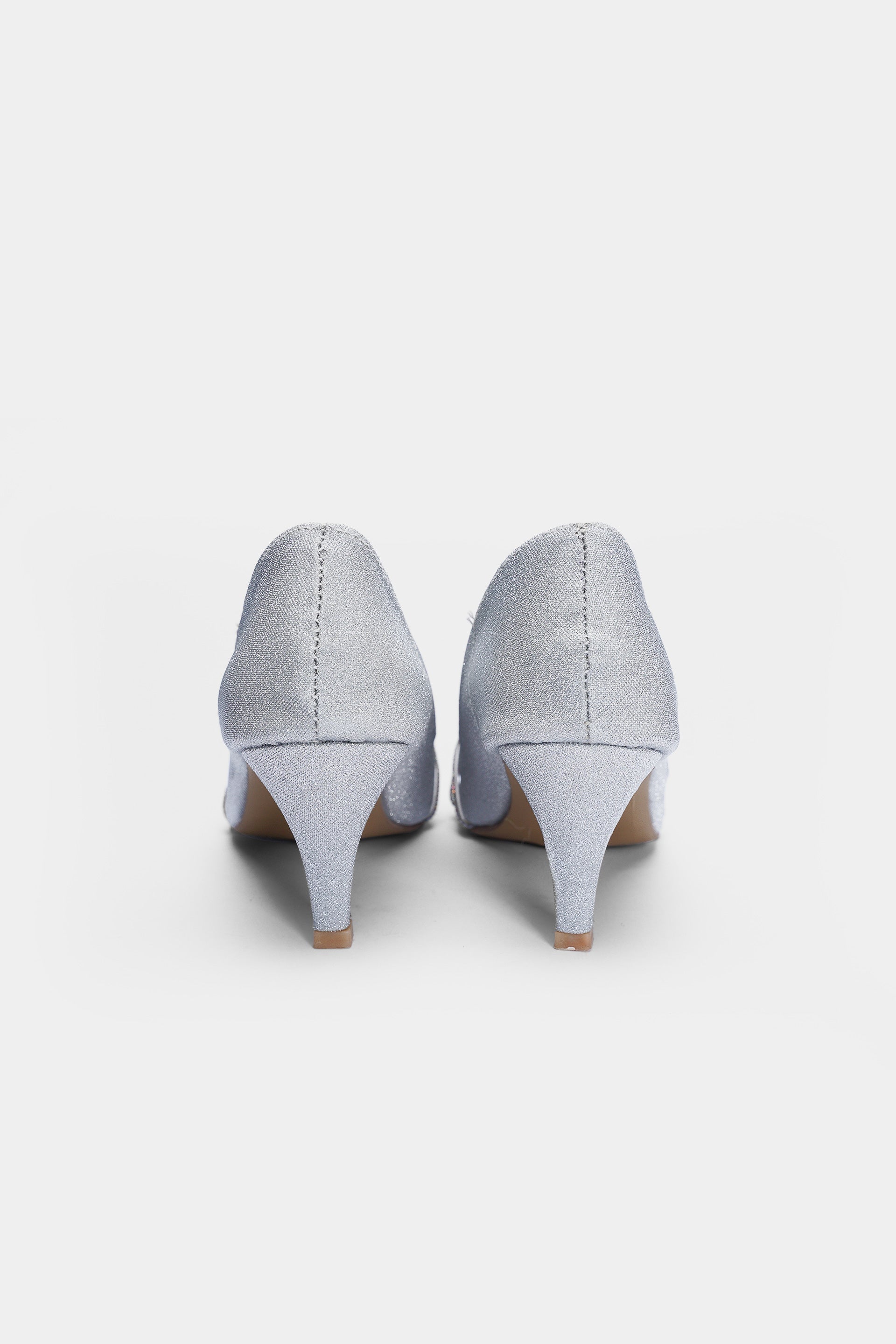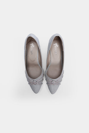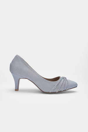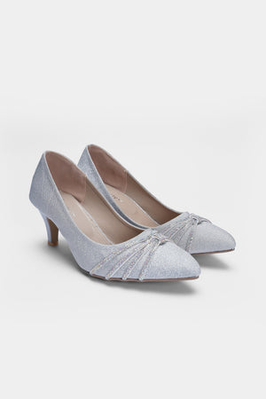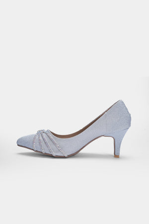 Step into sophistication with the Starlight Elegance Heels, a dazzling pair of silver high heels designed to turn heads. Featuring a pointed toe and mid-height heel, these shoes blend comfort with glamour. The glittery finish catches the light with every step, while the pleated front detail and rhinestone embellishment add a touch of refined charm. Perfect for weddings, evening parties, or any occasion that calls for a little sparkle.