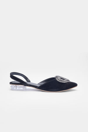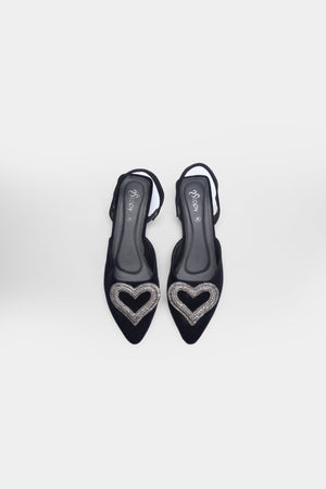 The Celeste Heart Slingbacks are a pair of black pointed-toe flat shoes designed to blend sophistication with a touch of whimsy. Each shoe features a dazzling silver heart-shaped embellishment made of rhinestones, adding a glamorous focal point. The slingback strap ensures a secure yet graceful fit, while the transparent heel section introduces a modern twist to the classic silhouette. With their low heel and sleek profile, these shoes are perfect for formal events, date nights, or elevating everyday outfits with a bit of sparkle.