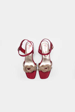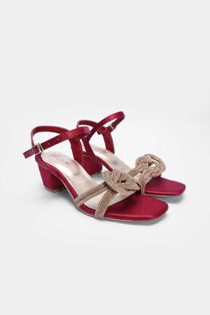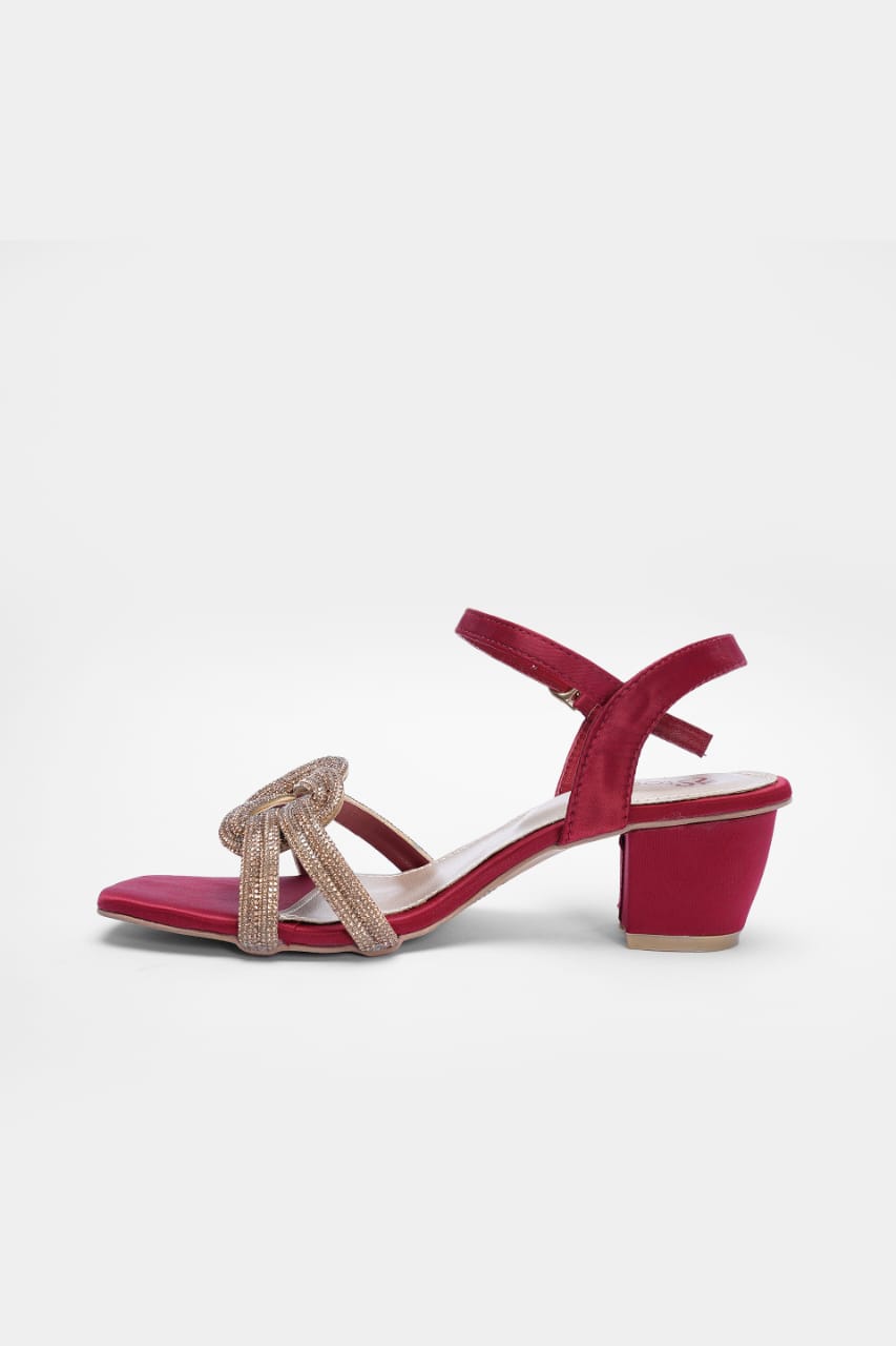 Step into sophistication with these rich crimson block-heeled sandals, wrapped in satin sheen and crowned with golden braided loops. The adjustable ankle strap and sturdy heel offer comfort without compromising glamour—perfect for festive nights or upscale soirées.