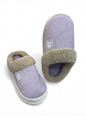 Wrap your feet in warmth and comfort with the SnuggleStep indoor slipper. Designed with a soft faux fur lining and a ribbed lavender exterior, this slipper blends cozy elegance with everyday practicality. The thick white sole offers cushioned support, while the playful side label adds a touch of charm. Perfect for lounging, relaxing, or padding around the house in style.