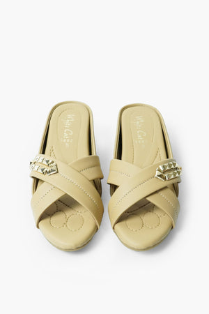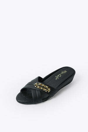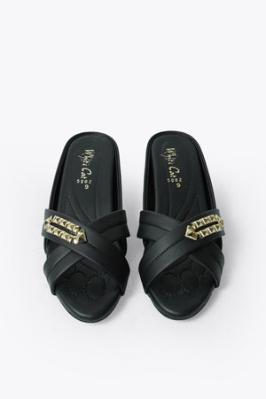 Step into understated luxury with these black slip-on sandals. Featuring crisscross straps and a gleaming gold accent, they blend comfort with refined style—ideal for everyday chic or evening flair
