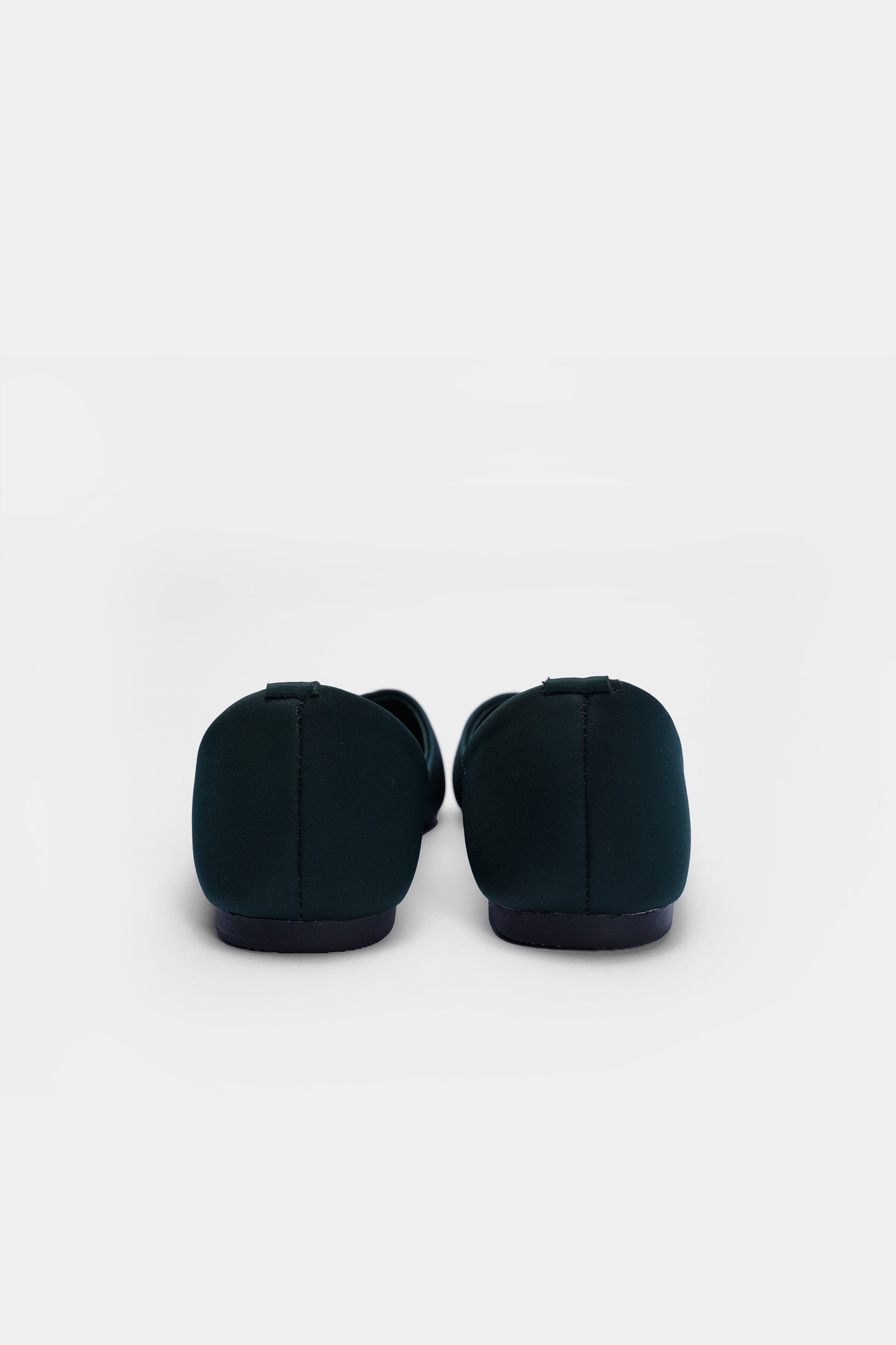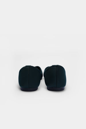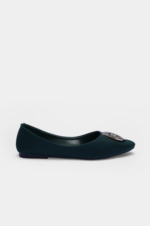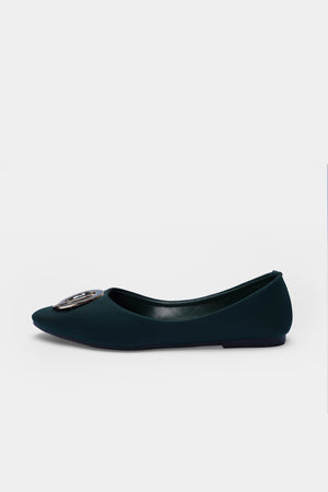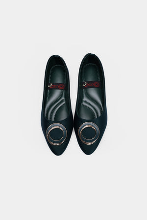 A pointed-toe flat in deep noir green, crowned with a gleaming metallic ring that adds instant polish. Sleek, versatile, and quietly bold—this is understated luxury for every step.