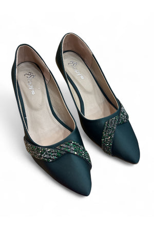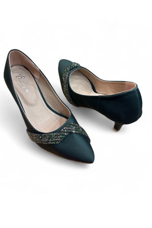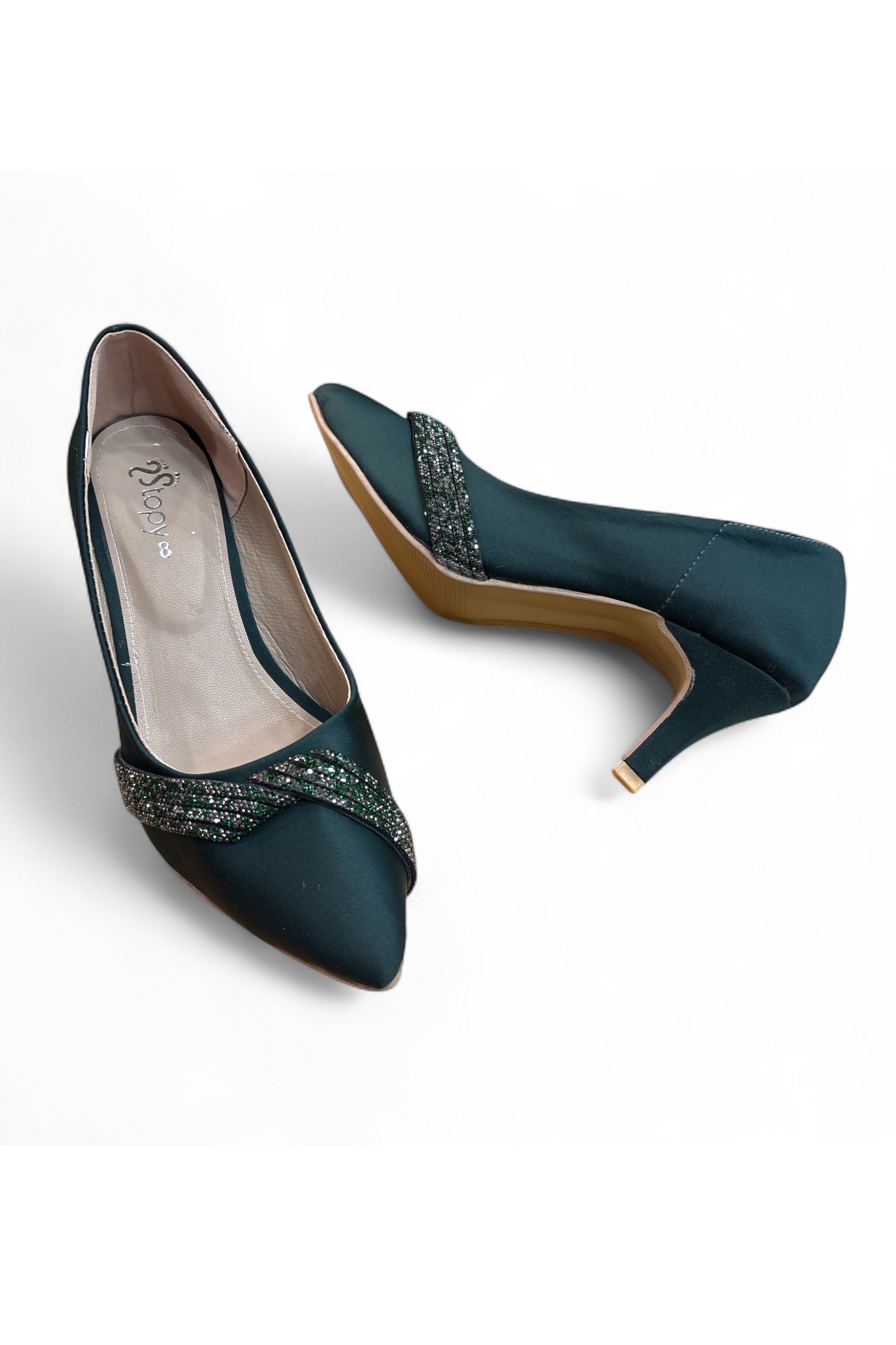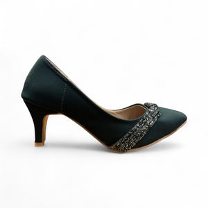 Midnight Criss blends sleek design with standout detail. A rich teal satin finish, pointed toe, and mid-height heel offer timeless polish, while the silver-white front accents deliver a modern twist. Ideal for formal wear with a fashion-forward edge