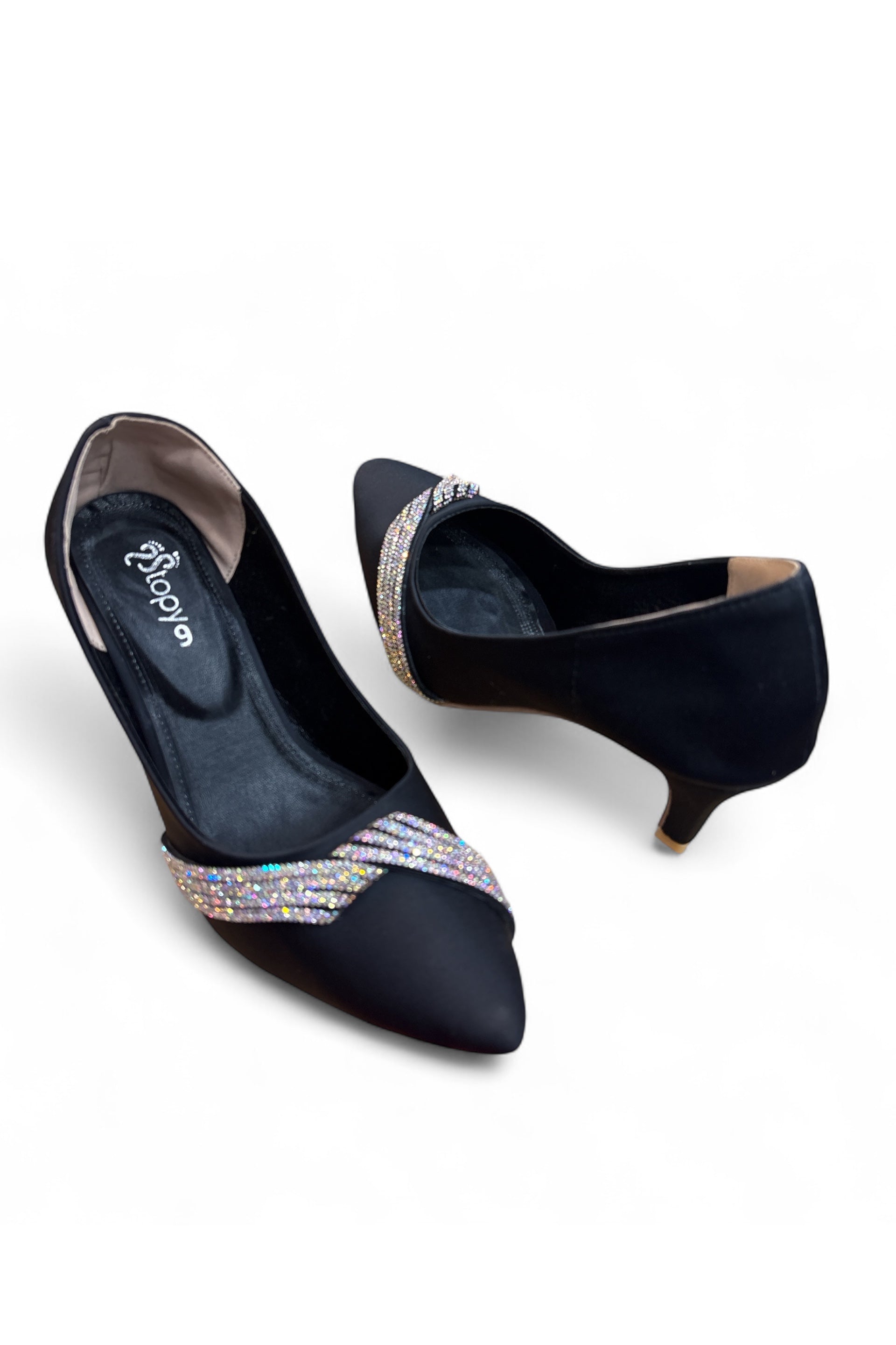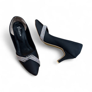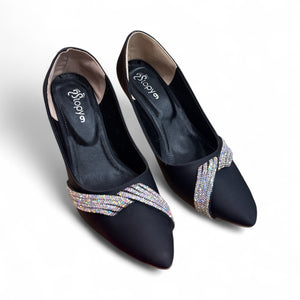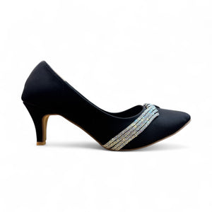 Midnight Criss blends sleek design with standout detail. A rich teal satin finish, pointed toe, and mid-height heel offer timeless polish, while the silver-white front accents deliver a modern twist. Ideal for formal wear with a fashion-forward edge