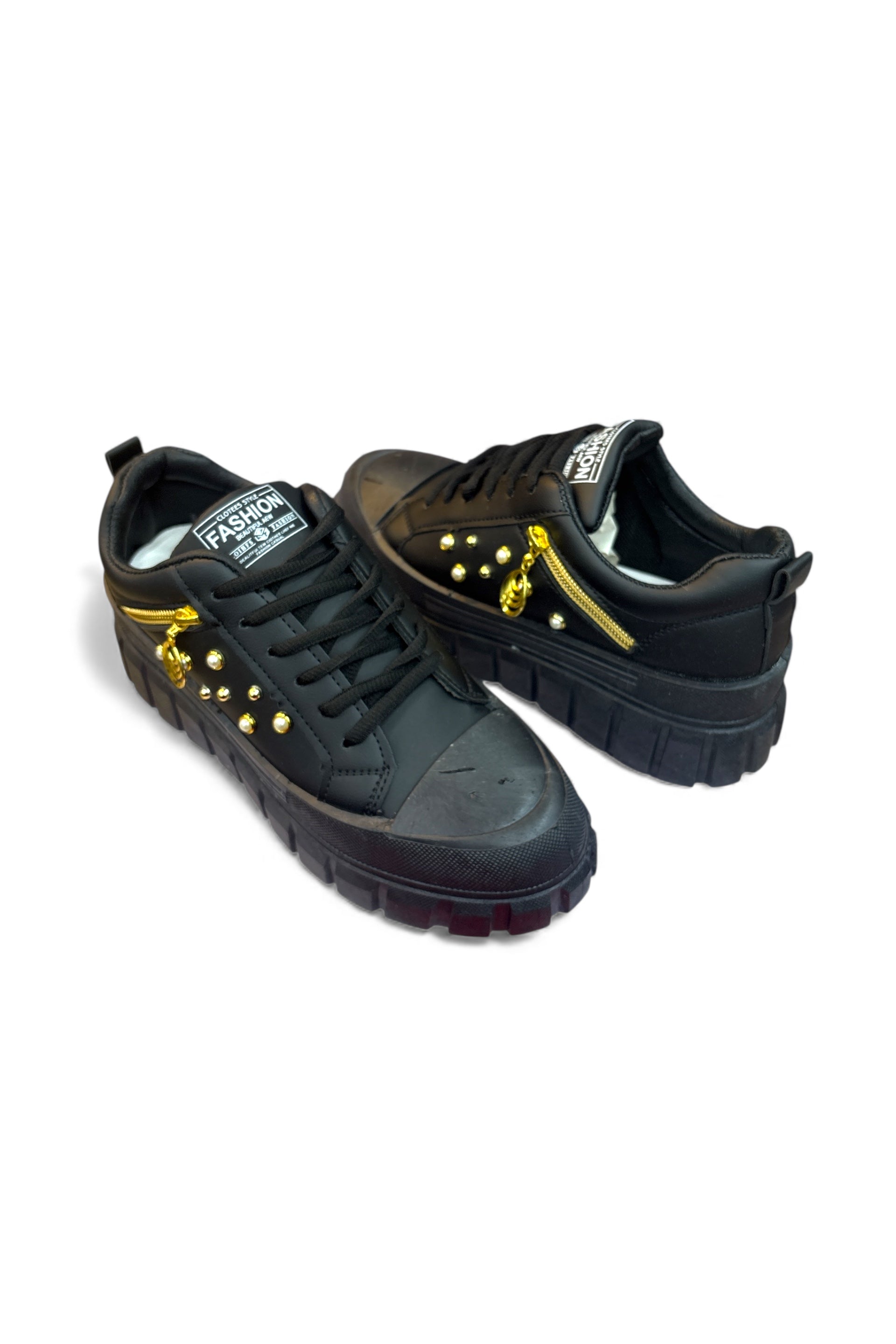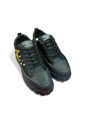 Step into bold sophistication with Noir Glint. These black fashion sneakers feature textured soles, luxe gold embellishments, and a comfortable fit—perfect for travel, style, and everyday flair