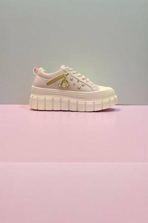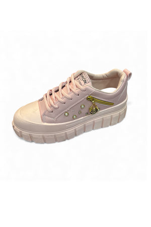 Step into charm with these blush-pink fashion sneakers, designed for trendsetters who love a touch of gold. Featuring textured soles, lace-up comfort, and decorative studs with a dangling charm, they blend street style with girly glam. Available in size 35-36.