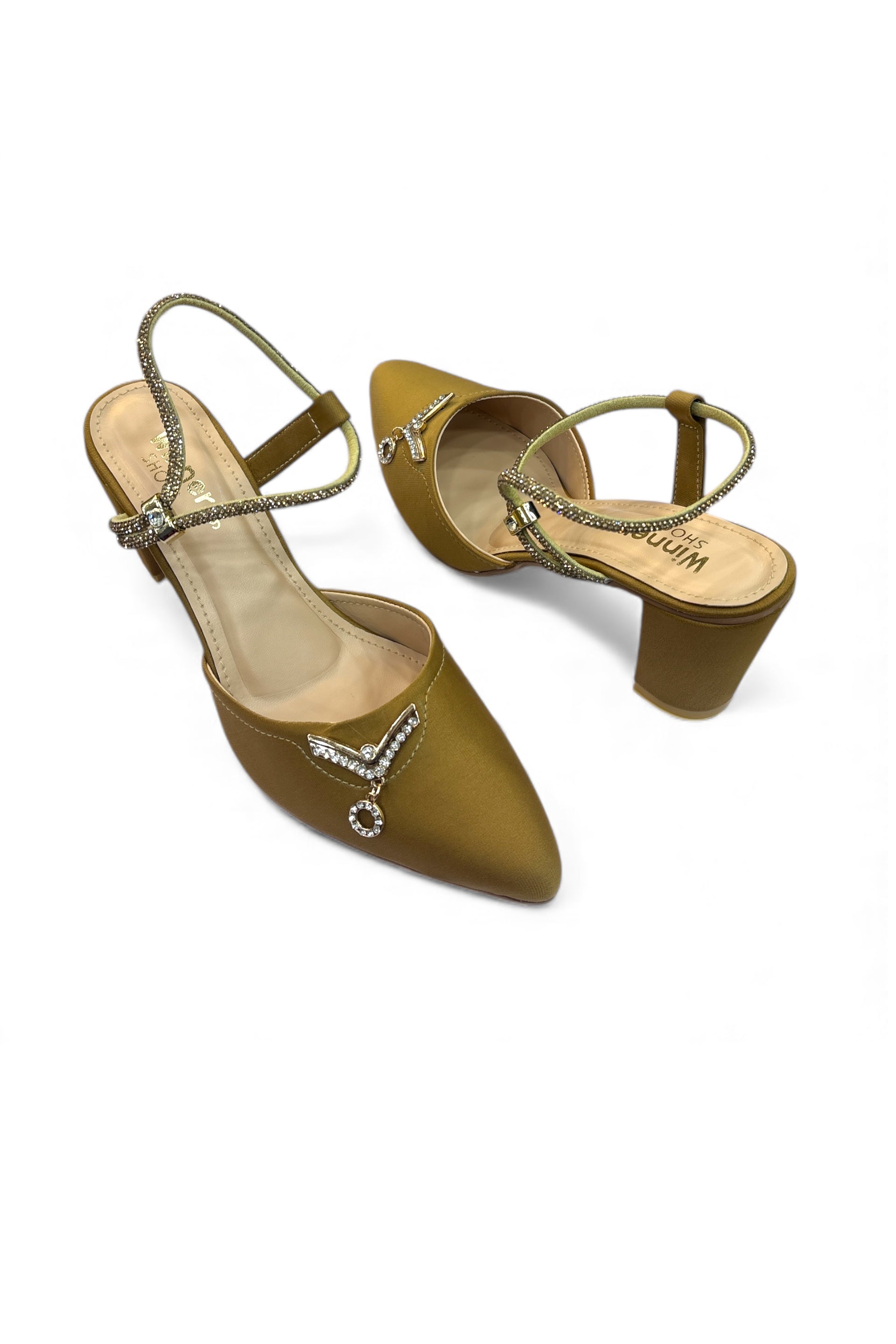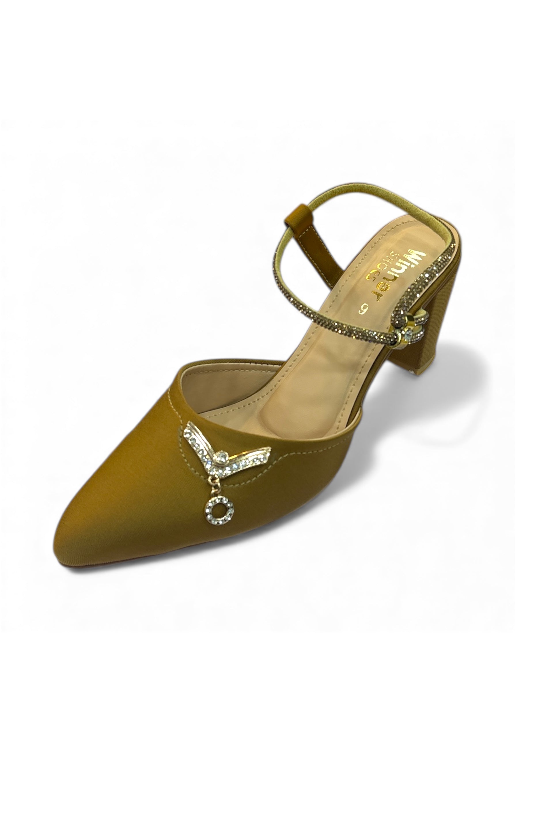 step into timeless elegance with Zarqa Gleam. These golden-brown pointed-toe shoes feature a textured fabric finish, glittery ankle straps, and a rhinestone-studded bow for a regal touch. Perfect for festive soirées and formal occasions.