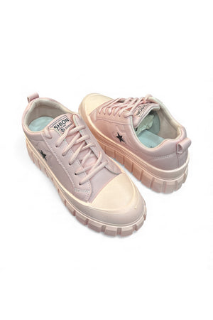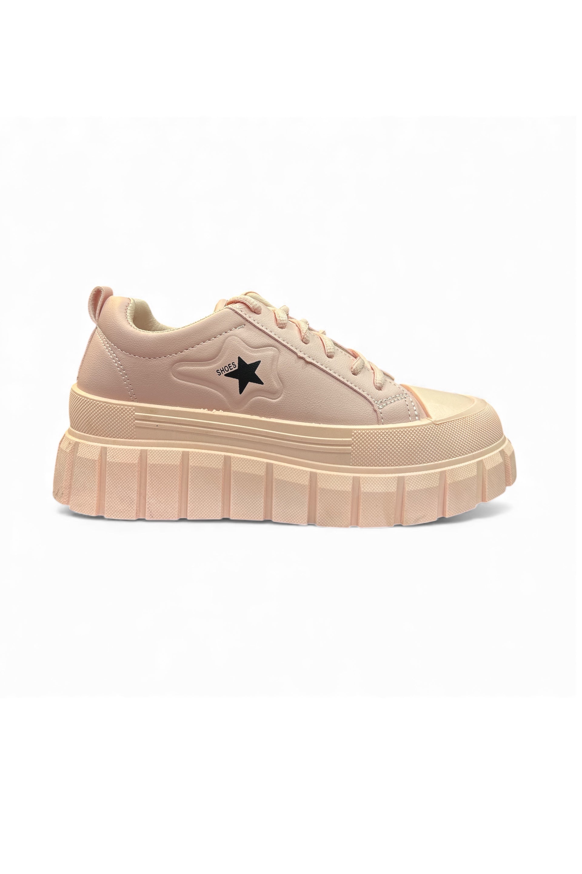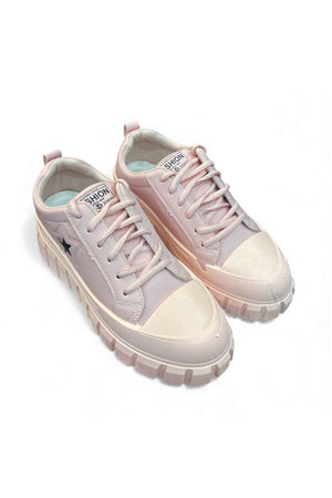 Step into style with the Blush Bolt—a light pink sneaker that blends sporty edge with playful charm. Featuring rugged textured soles for extra grip, crisp white toe caps and laces, and a bold black star accent near the heel. The tongue label reads “FASHION SHION SPORT,” adding a trendy twist. Perfect for everyday wear, street style, or casual outings.